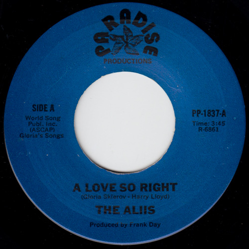 ハワイアン・ソフトロック・コーラスとして、DON HOとの共演など60年代から清々しいハーモニーを聴かせるTHE ALIIS。80年代にもシングルを残しています。「A LOVE SO RIGHT」、「UNTIL NOW」をカップリングした7インチ。